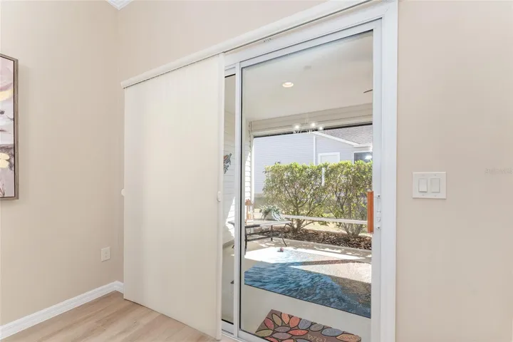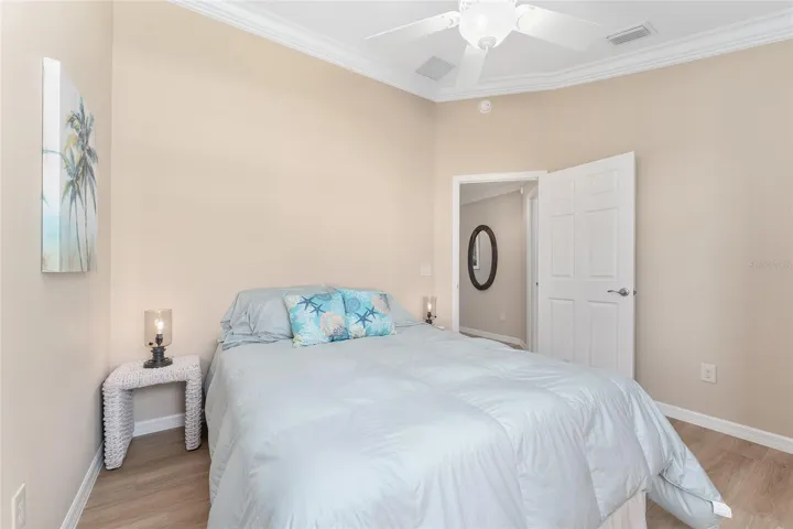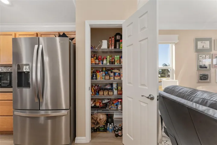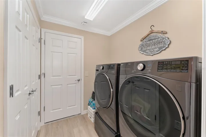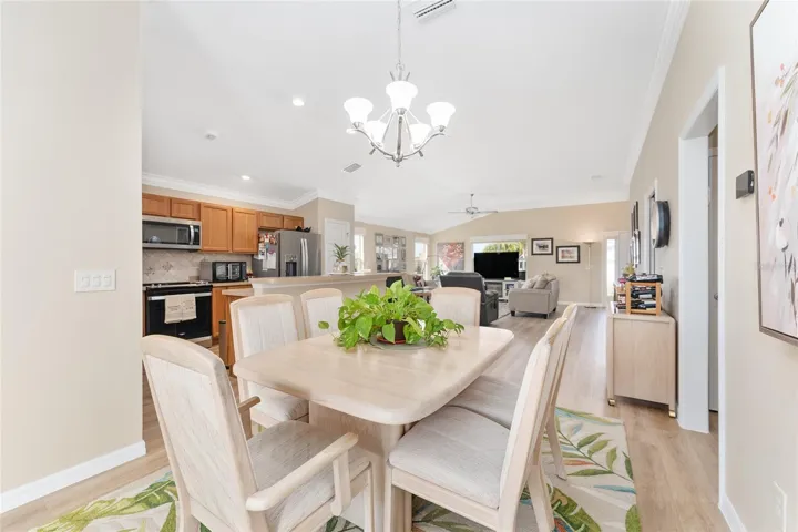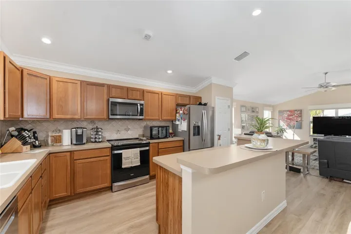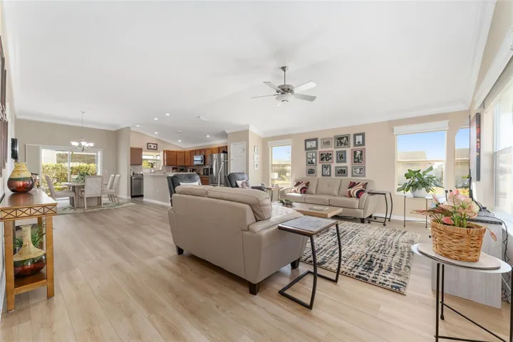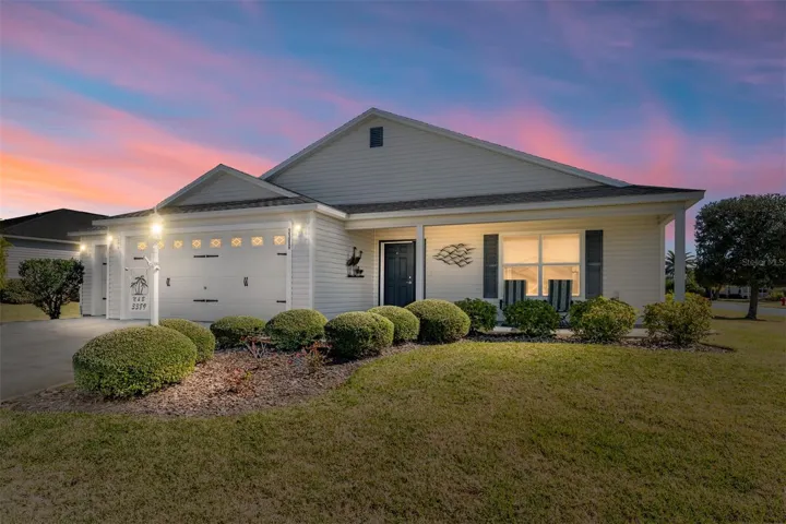 NO BOND! NEW ROOF! NEW A/C! GOLF CART GARAGE! NEUTRAL FRESH PAINT! NEW NEUTRAL LUXURY VINYL FLOORS! CORNER LOT! BEAUTIFUL HONEYCOMB WINDOW SHADES THRU-OUT! This beautiful Hammock Floor Plan has it all! Everything is peaceful and neutral; this home exudes comfort and warmth. As you arrive you will see the front porch has a couple of chairs to watch the world go by. Open the front door to a foyer entry with coat closet, enter your new, spacious living room and notice the BEAUTIFUL upgraded crown molding, the warm, neutral flooring, and fresh paint. The open kitchen and dining are great for entertaining with upgraded cabinetry, pull-out shelving and outfitted with large deep drawers for easy storage, a large pantry and all new Whirlpool appliances. Large primary suite with vaulted ceilings and ensuite bath, offers dual sinks, bidet and walk in shower. Second and Third bedrooms both with closets. Second bath with shower, tub and bidet. Whole House Water Softener, brand new Washer and Dryer, laundry tub, a/c and water heater are inside the laundry room Spacious 2 car garage with GOLF CART GARAGE! So many thoughtful considerations in this lovely home, Come and see this beautiful home today!