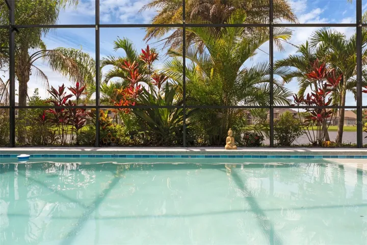 Outside, an oasis awaits, featuring a sparkling pool with a screened enclosure, surrounded by lush landscaping and a serene pond view. Watching the sunsets from this relaxing back patio is a spectacle of nature’s best artist canvassing the skies in the most brilliant colors and leaving you with a feeling that all is right with the world, and you are exactly where you need to be.