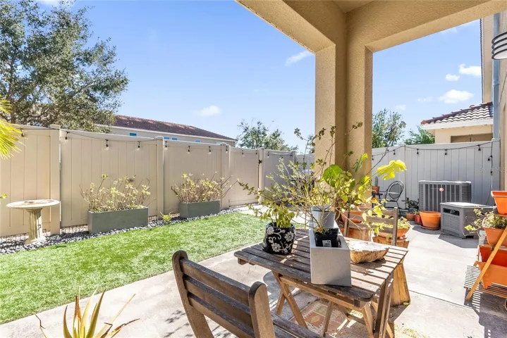 The living and dining areas flow seamlessly to a covered patio and private fenced backyard, creating an ideal indoor/outdoor setup for relaxing, grilling, or enjoying your own low-maintenance outdoor space.