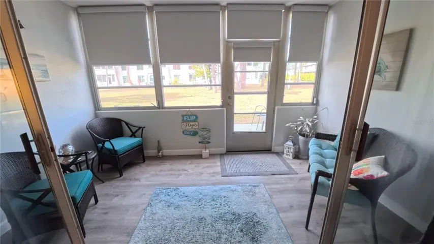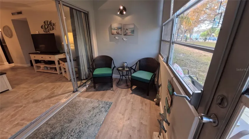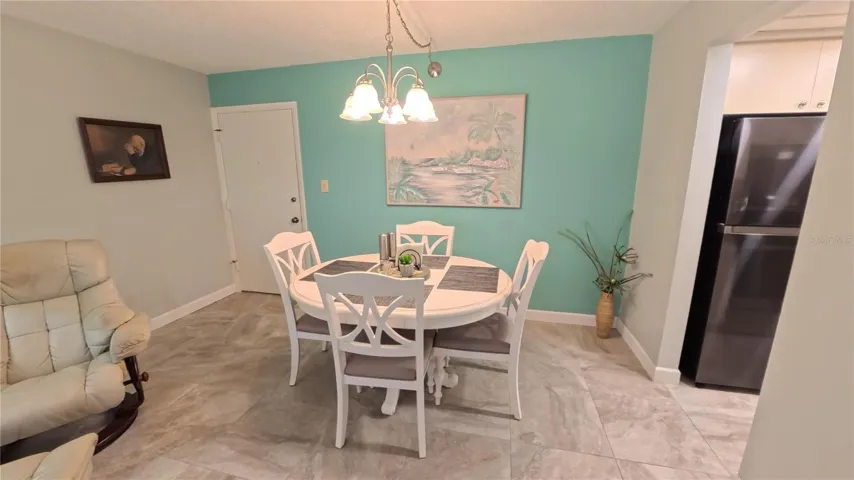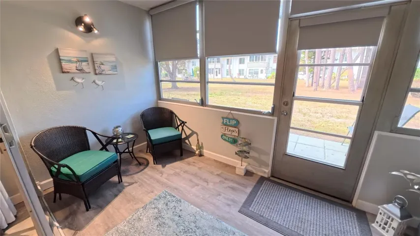 The bright, open living and dining area features tile flooring throughout, neutral coastal décor, and sliding doors leading to an enclosed lanai—perfect for relaxing and enjoying the Florida lifestyle. The kitchen offers ample cabinet and counter space and is open to the dining area for easy entertaining.