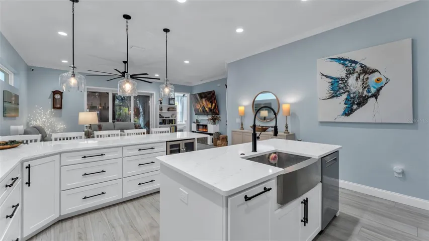 Inside, the home features wood look tile flooring, crown molding, and a spacious open layout designed for comfort and ease. The beautifully designed kitchen includes quartz countertops, abundant cabinetry, a large walk in pantry, a commercial size refrigerator, induction cooktop, and two islands, making it ideal for both everyday living and entertaining. The living areas are bright and inviting, offering a relaxing retreat after a day of travel or activities. This split floor plan offers 2 private suites perfect for guests or added privacy.