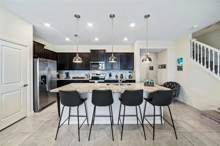 Welcome to 617 Jasmine Ln, a fully furnished townhome located in the highly sought-after Windsor Island Resort. This turn-key 5-bedroom, 4-bathroom property offers exceptional privacy with no rear neighbors and is designed for comfort, style, and flexibility. The open-concept main level features a modern kitchen with ample cabinetry, stainless steel appliances, and a breakfast bar that flows seamlessly into the dining and family room—ideal for entertaining or everyday living. Upstairs, a spacious loft provides additional space for a game room, media area, or relaxation retreat. Enjoy Florida living outdoors with a private splash pool and covered patio, perfect for unwinding in a serene setting. Windsor Island Resort offers resort-style amenities including a gated entrance, clubhouse, fitness centre, resort pool with lazy river, splash pad, playground, and an on-site restaurant and bar. Conveniently located near major attractions, shopping, and dining. This property is well-suited as a primary residence, vacation home, or income-producing rental. Listing agent is also the managing agent and can provide income and expense information upon request. All information is deemed accurate but should be independently verified by buyers and buyer’s agent.