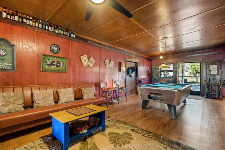 An expansive enclosed area 15’x55′ (not heated or air conditioned but good easily converted living space), is an entertainer’s dream, complete with a bar, built-in bookcases, and generous storage plus a pool table that is negotiable. From here, step out to a 17’x25′ screened porch overlooking the four wood decks, a covered outdoor grilling area, a sheltered hammock space, and your own private beach with stairs leading to the water. All outdoor furniture is negotiable!