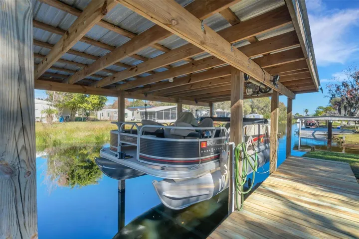 The lakefront amenities continue with a 97×6 foot fishing pier, a dock, PLUS a covered boathouse with lift on the canal side, offering easy access to the lake. All furniture, pontoon boat, paddle boat, and kayaks are negotiable, making this an incredible turn-key opportunity.