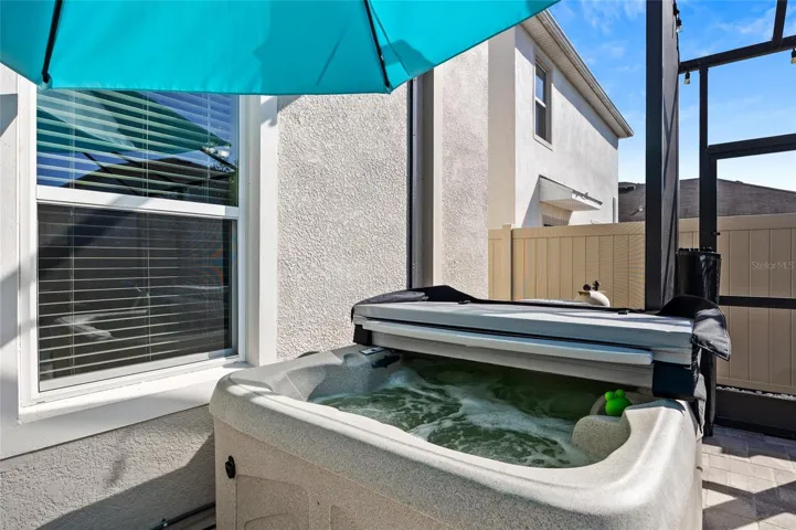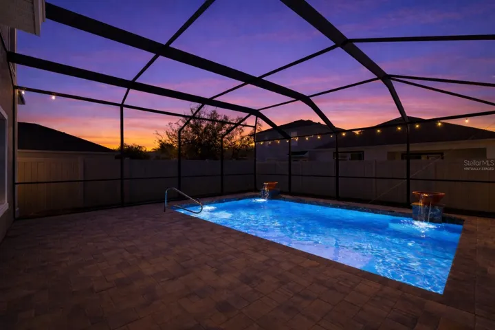 The backyard offers a private retreat with a custom Pebble Tec saltwater pool featuring a sun shelf, LED color-changing lighting, decorative water features, and a brick paver deck, all enclosed in a bronze screen enclosure. A new pool pump adds efficiency and peace of mind, while the included hot tub is perfect for relaxing year-round. The yard is fully fenced with PVC fencing and finished with low-maintenance artificial turf, ideal for pets.