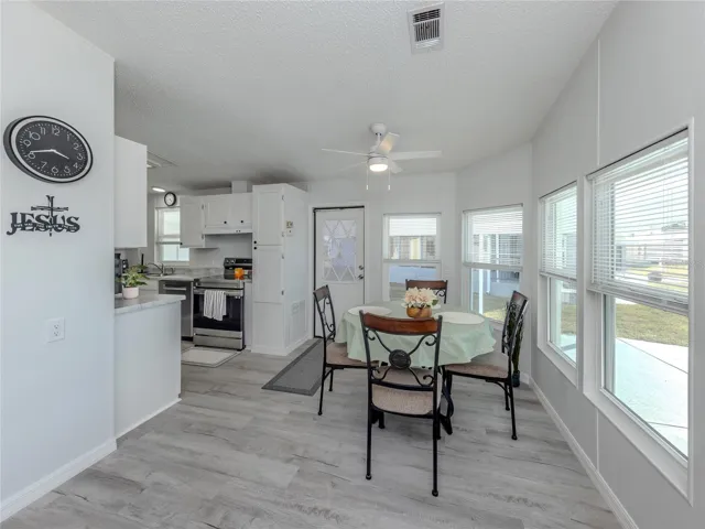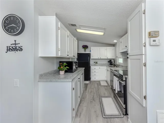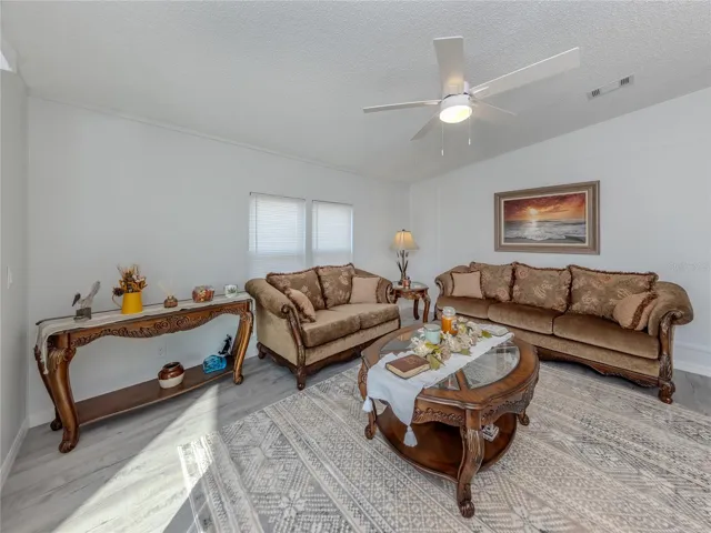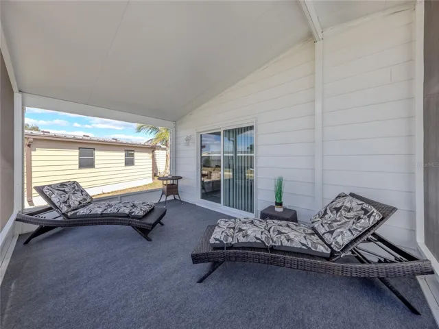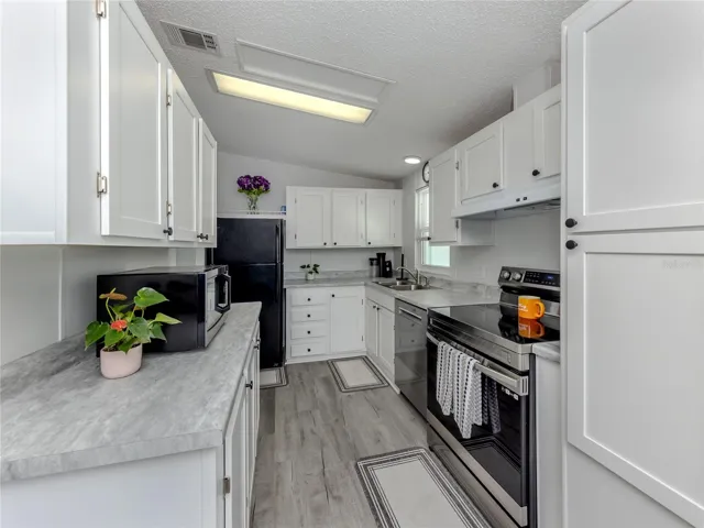 This totally remodeled manufactured home sparkles from top to bottom and is tucked away on a quiet cul-de-sac in the pet-friendly, land-owned Harbor Isles community. Offered furnished, this move-in-ready home makes it easy to start enjoying the Florida lifestyle right away. The bright kitchen features refaced cabinetry, new countertops, and a new range and dishwasher, blending style and function beautifully. Vaulted ceilings, brand-new luxury vinyl flooring throughout, and abundant natural light create an open, airy feel. A lovely new front lanai, located just off the living room, provides the perfect spot to relax and unwind. Major updates include a new roof, windows, and carport, all completed in 2024.