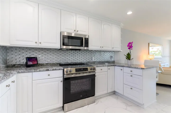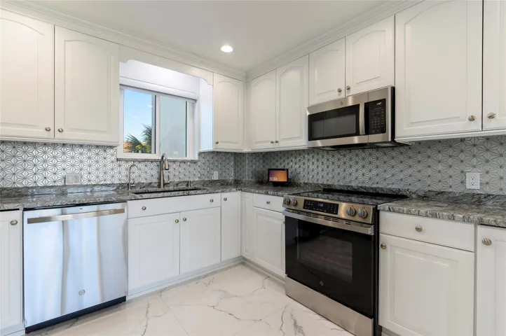 The kitchen is equipped with a newer GE refrigerator, along with a brand-new GE stove, dishwasher, and microwave. Additional upgrades include all-new hurricane-rated windows and a hurricane-rated front door. A utility closet houses the hot water heater, electric panel, and provides extra storage.