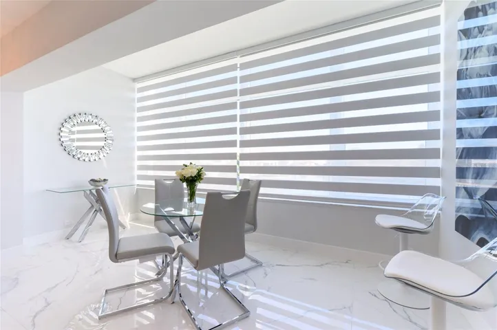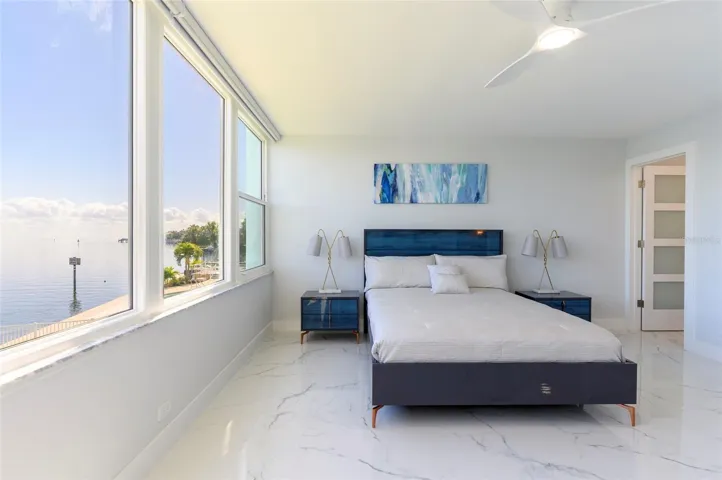 This two-bedroom residence features ensuite bathrooms for both bedrooms. The primary suite boasts breathtaking water views and two closets, while the second bedroom also offers two closets. The unit includes an interior laundry area with a Bosch washer and dryer and a high-tech dryer vent system.