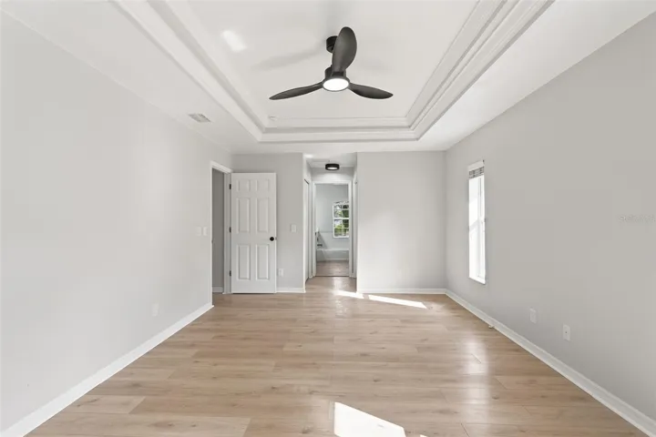 The primary suite is a true retreat, featuring a tray ceiling, walk-in closets, and a beautifully finished bath with subway tile, a glass-enclosed shower, separate soaking tub, and dual sinks. The guest bath is equally well-appointed with modern lighting and a shower/tub combination. A generously sized laundry room adds everyday convenience.