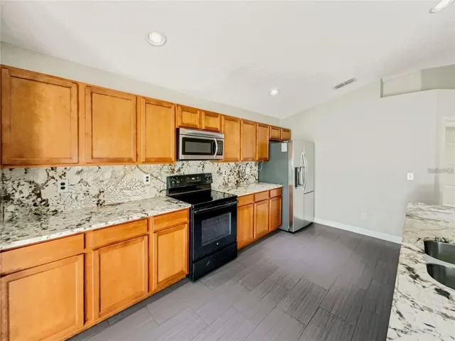 The living room, dining room, and kitchen have tiled floors and all bedrooms have luxury vinyl flooring, vaulted ceilings, with lots of windows that provide plenty of light. This 4 bedroom and 2 bathroom home offers a spacious living/dining room area, kitchen with all appliances and huge breakfast bar, ceiling fans in all bedrooms, and master bathroom has been updated. The large Master bedroom can fit king-size furniture and has a large walk-in closet. The master bathroom features a full corner tub, 2 sinks vanity, and walk-in shower. Two-car garage. Huge backyard! Pet friendly. The community of Doral Pointe has a pool and playground. Minutes to I-4 making easy access to the newest attraction LEGOLAND, Walt Disney World and Downtown