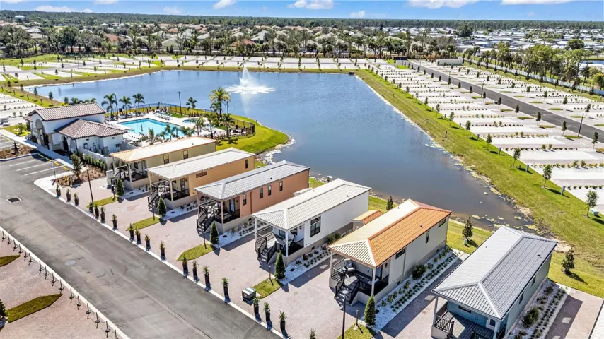 in mind … because after all, living well is living beautifully. Interior includes baseboards and window casings throughout, faux wood cordless blinds, Cable Jack and CAT6 in Living Room and Bedroom. Kitchen has quartz countertops and shaker panel cabinetry with soft close hinges and drawers. GE appliances, Moen pull down spray kitchen faucet, stainless steel 16 guage under-mount kitchen sink, and full height tiled backsplash. Bathroom has Acrylic shower surround walls and shower pan. Clear glass shower door, quartz countertop, Moen bathroom accessories, TOTO Drake elongated toilet, and white porcelain under-mount sink. Laundry includes Washer and Dryer. Construction meets Florida Modular Certification, TRA Green Certified, and Built to Florida Wind Zone 3. Property has Extended Warranty. The gated community has on-site management, a dog park, curbside trash pickup, landscape trimming of trees and shrubs, lawn mowing, edging and blowing, and irrigation. For your enjoyment, there is an outdoor pavilion, saltwater pool and spa, grill station, social spaces with seating and TV’s, Fire Pit, Corn-hole, and mail station. There are five different floor plans from which to choose and call home . Don’t miss this opportunity to have a new style of life, a “get away” property or a investment for rentals. Storage Unit can be added for additional cost. NOTE: Waterfront Lots $850.00/month