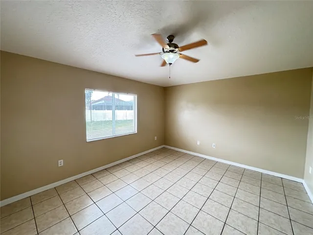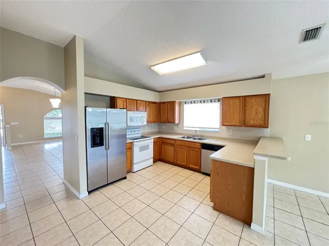 The kitchen features a generous breakfast bar and large dining area, flowing seamlessly into the main living space and an additional great room, both with soaring vaulted ceilings. Ceramic tile floors run throughout the entire home, offering a clean, modern look and easy maintenance, while ceiling fans in every room keep things comfortable year-round.