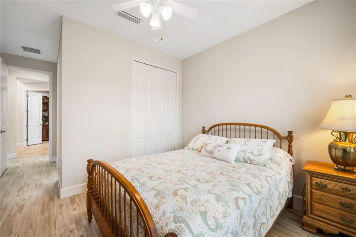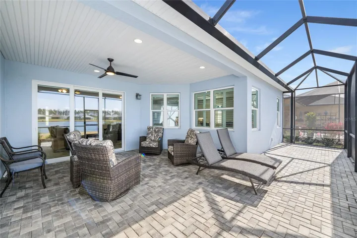 Additional upgrades include plantation shutters on all windows, custom adjustable closet organizers throughout, soft-close upgraded cabinetry, ceiling fans and lighting in every room, a built-in desk in the den, and a keyless front entry. Enjoy Florida living year-round on the expanded and screened lanai, complete with powered drop-down screens on the sliding glass doors.