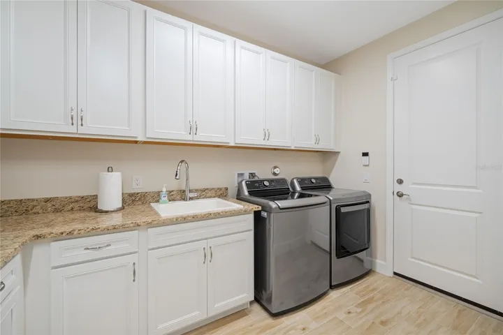 The primary suite offers a private retreat with two walk-in closets and a spacious bathroom featuring a large walk-in shower with handheld shower head and tile extending to the ceiling. Bathrooms and laundry areas include granite countertops, abundant cabinetry, and thoughtful storage solutions, including extra cabinetry in the laundry room, powder room, and primary water closet. The laundry room also includes a utility sink and additional cabinets.
