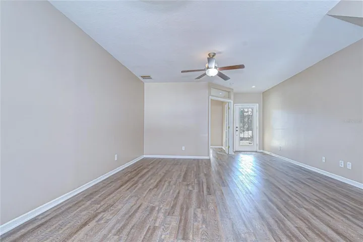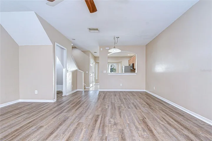 Welcome home to Foxmoor Townhomes at Panther Trace, an established gated community offering low-maintenance living in a prime location. This well-maintained townhome features two bedrooms, two and a half bathrooms, plus a versatile den with double French doors that could easily serve as a third bedroom or home office. Step inside to a bright, open floor plan where laminate flooring flows seamlessly through the combined living and dining areas and into the functional kitchen. The kitchen is thoughtfully designed with ample cabinetry, a closet pantry, and convenient access to a half bath and under-stair storage closet, maximizing everyday functionality. Sliding glass doors lead to an enclosed porch and patio—ideal for outdoor seating or entertaining—which also provides access to the townhome’s secured storage unit. Upstairs, the primary suite offers a walk-in closet and a private en-suite bath with a tub/shower combination. The secondary bedroom is generously sized and located near a full bathroom, making it perfect for guests or additional household members. Enjoy the ease of townhome living with top-rated schools and close proximity to shopping, dining, and major commuter routes. Conveniently located just off U.S. 301, Foxmoor Townhomes provides quick access to restaurants, retail, entertainment, downtown Tampa, MacDill Air Force Base, and everything Florida has to offer. Whether you’re a first-time buyer, downsizing, or seeking a turnkey investment, this home offers exceptional value and lifestyle appeal.