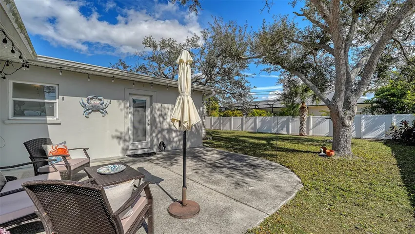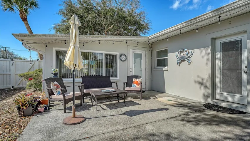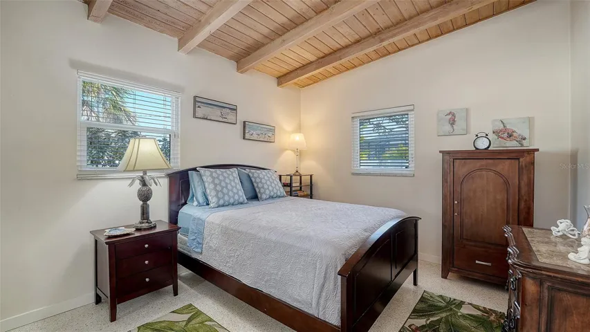 WELCOME TO OLD FLORIDA CHARM~ PRIVATE COTTAGE ON VENICE ISLAND. Nestled in the heart of the serene community of Golden Beach, this charming TURNKEY FURNISHED 2 bed/1 bath cottage has been lovingly renovated throughout. As you enter through the front door, you are met with an open spacious living area featuring beautiful wood high ceilings and original terrazzo floors. The living room has been extended to include a glass enclosed multi-functional space with pull-out sofa and a desk which can be used for an office or additional guest sleeping quarters. Enjoy morning coffee from your private patio with large fenced in yard offering privacy and gorgeous mature oak trees. The galley kitchen has stainless steel appliances and stone countertops. The primary bedroom features a king size bed and TV with private access to the patio. The second bedroom offers a queen size bed and TV. Washer and dryer in closet for added convenience. Paradise is right at your doorstep. This property offers deeded Beach access to Golden Beach which is less than a mile away. Nice carport offers easy access for entry to the cottage and unloading groceries. Keeps your car in the shade. Large fenced in yard can accommodate a small pet with owner approval. Located on Venice Island, 1 mile from Sharky’s Pier and Public Beach. Enjoy all downtown Venice has to offer. Fine Dining, shopping and beaches all within minutes of the cottage. This property CAN BE RENTED LONG OR SHORT TERM. Call for annual pricing. Come and live the Florida Lifestyle today! This little gem will not last long!