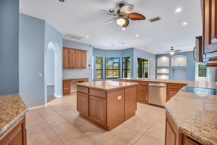 The spacious kitchen has lots of beautiful wood cabinets; an Island; a desk area; and granite counter tops.