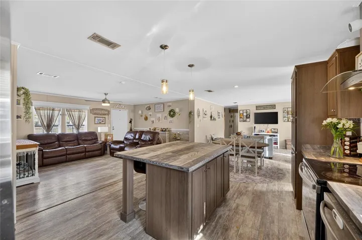 Welcome to peaceful country living at 39344 Bohan Lane—a modern yet cozy 4-bedroom, 2-bath manufactured home built in 2019 and situated on a full one acre in Zephyrhills. This property offers the freedom and privacy of rural living with fully fenced backyard and plenty of space to spread out, store your work equipment, boat, trailer, or other toys, and includes a convenient on-site RV hookup—perfect for RV owners, visiting guests, or eliminating off-site storage fees. Inside, the home features beautiful luxury vinyl plank flooring throughout, creating a warm, cohesive feel. The open-concept living space is perfect for everyday comfort and entertaining, anchored by a stylish kitchen with butcher block countertops and ample cabinetry. Natural light flows through the home, enhancing its inviting, modern farmhouse vibe.