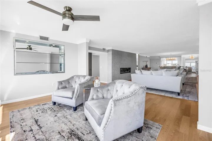A wall of glass in the main living area captures a mesmerizing panorama of open water views, evening sunsets, the Don CeSar’s soft glow, and the twinkling lights of the Tierra Verde Bridge. A statement stone accent wall and sleek electric fireplace add warmth and understated elegance.