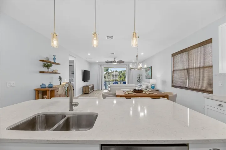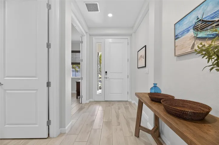 The perfect split floor plan places the office at the front of the home, ideal for working from home or as a private study. The open-concept living area flows seamlessly toward the water, making it perfect for entertaining family and friends or relaxing while taking in the waterfront scenery. The upgraded kitchen features stainless steel appliances, beautiful quartz countertops, custom backsplash, and a large island with seating for casual dining and conversation. The primary suite includes two walk-in closets, providing exceptional storage space. The well-cared-for home features contemporary finishes throughout and includes a spacious 2-car garage for convenience and storage.
