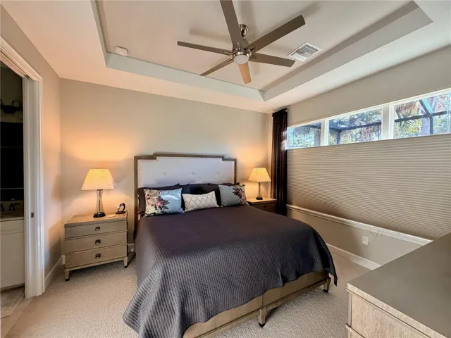 This beautifully appointed Ibis villa offers an exceptional opportunity to enjoy maintenance-free living in the highly sought-after Esplanade at Azario in Lakewood Ranch. Designed for comfort, convenience, and effortless entertaining, this home is ideal for those looking to downsize, relocate, or enjoy a seasonal Florida retreat. A landscaped private walkway leads to the front entry and into a light-filled, open-concept layout featuring tray ceilings, crown molding, and thoughtfully selected upgrades throughout. The kitchen, dining, and living areas flow seamlessly, creating an inviting space for everyday living and entertaining with gorgeous wood-look porcelain tile. The well-appointed kitchen features shaker-style cabinetry, stainless steel appliances, and generous counter space. The dining area is ideal for casual meals or intimate gatherings, while the living room opens through sliding glass doors to an extended screened-in lanai, providing a private setting to enjoy Florida’s indoor-outdoor lifestyle with no rear neighbors! Sunshades have been added to the lanai area for maximum privacy and sun-filtering. The primary suite offers a peaceful retreat with a tray ceiling and a large picture window. The ensuite bath includes dual vanities, a spacious walk-in shower, and an oversized walk-in closet. A private guest suite is located on the opposite side of the home and features its own walk-in closet and full bath. A versatile den with pocket doors provides flexible space for a home office, media room, or additional guest area. Additional features include a two-car garage with ceiling-mounted storage. Residents of Esplanade at Azario enjoy world-class, resort-style amenities, including a full-service spa, Bahama bar, multiple resort pools, fitness center, Culinary Center, Barrel House restaurant, on-site pizzeria, coffee shop, and a vibrant calendar of social events. The community also offers an 18-hole championship golf course with pay-to-play access through 2026, tennis, pickleball, and scenic walking trails. Conveniently located in the heart of Lakewood Ranch, this home provides easy access to top-rated schools, shopping, dining, and Gulf Coast beaches. This villa offers the perfect blend of luxury, convenience, and an exceptional lifestyle. Come live the good life in Azario!