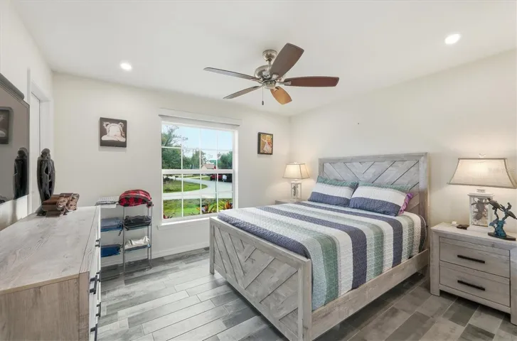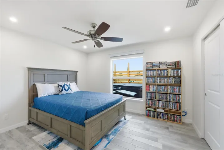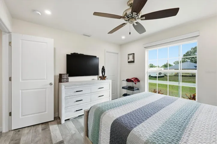 Enjoy outdoor living year-round in the screened lanai featuring tile flooring, recessed and accent lighting, ceiling fan, and speaker prewiring. Just beyond, a 10×20 concrete slab with hot tub and privacy fencing creates a private backyard retreat. The spacious primary suite includes recessed lighting, a walk-in closet with a beautiful barn door, and a spa-like bath with quartz counters and dual sinks. Bedroom two is wired with Cat 6, making it ideal for a home office, while bedroom three offers a generous walk-in closet. The guest bath is equally impressive with a walk-in shower, heated exhaust fan, quartz vanity, recessed lighting, and toe-kick accent lighting.