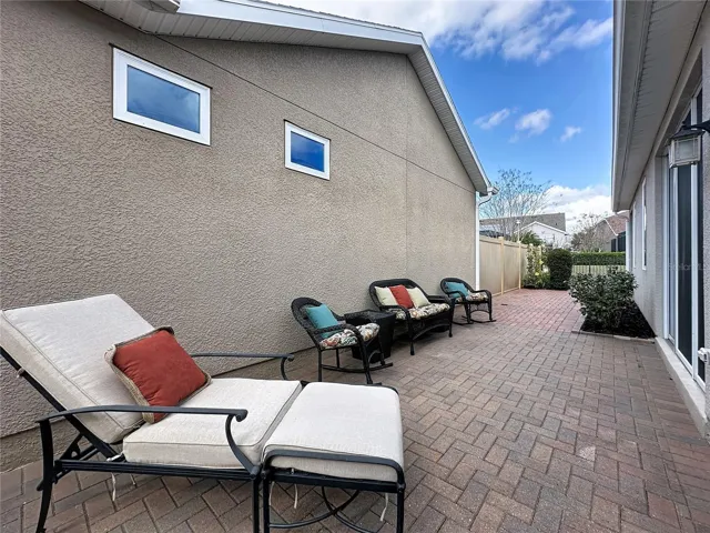paver driveway and walkway, screened rear lanai, and an extensive paved side yard ideal for relaxing or entertaining. Inside, enjoy a light-filled interior with crown molding, plantation shutters, a built-in workstation, and an upgraded