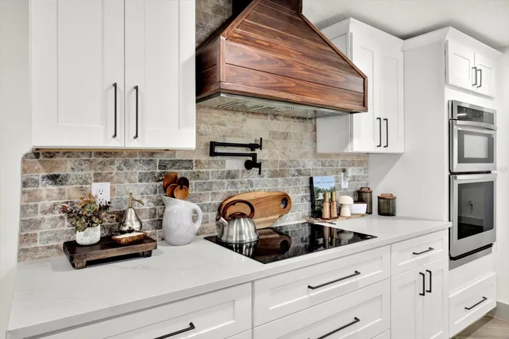 Interior highlights include new double-pane windows, herringbone tile flooring, modern lighting, fresh paint, and an updated kitchen with shaker cabinetry featuring soft-close drawers, a waterfall-edge quartz peninsula, shiplap hood, and brand new appliances. Both bathrooms have been tastefully updated, and major improvements include a new roof, AC, and water heater.