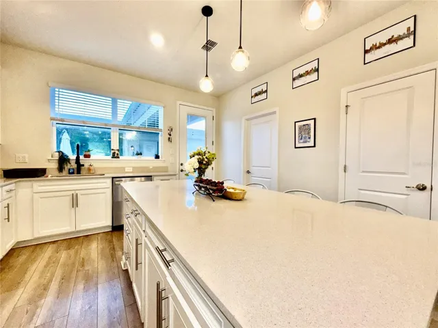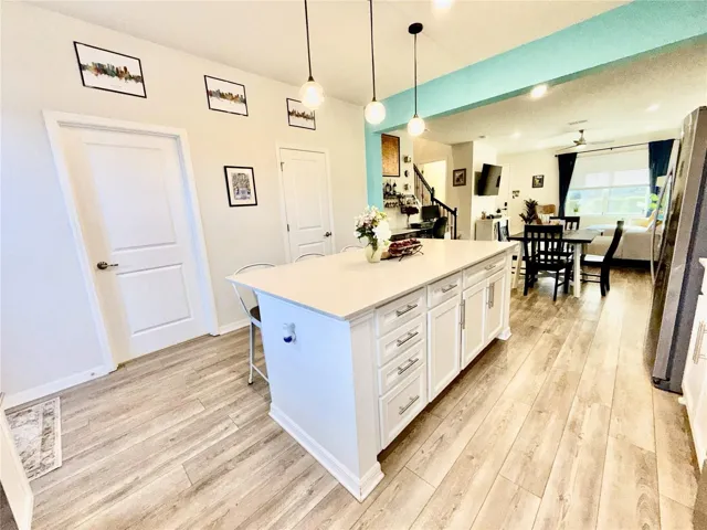 The large open kitchen offers a large island with seating for four, granite countertops, 42-inch cabinetry, and stainless-steel appliances. Oversized windows fill the space with natural light, while the adjacent laundry room includes storage shelving and a walk-in pantry for added convenience.