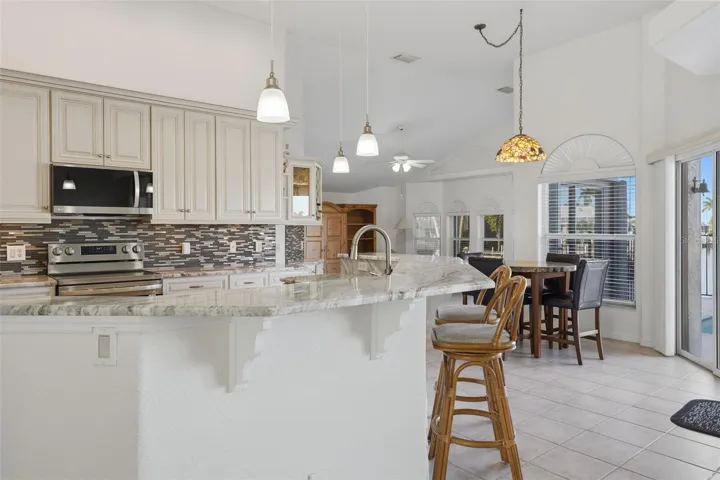 Inside, this single-level home offers just under 1,920 square feet of bright, functional living space designed for easy Florida living and entertaining. Tile floors flow throughout the main areas, while large windows and sliding glass doors flood the home with natural light and showcase tranquil canal views. The kitchen is equipped with updated appliances, including a smart convection range, refrigerator, dishwasher, and microwave—perfect for everyday meals or entertaining guests.
