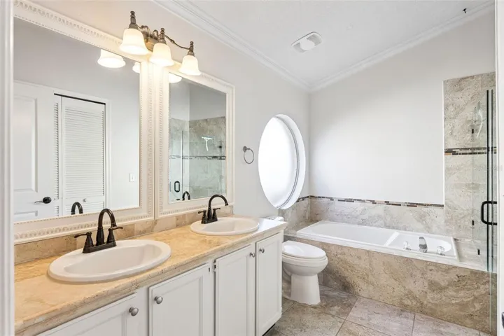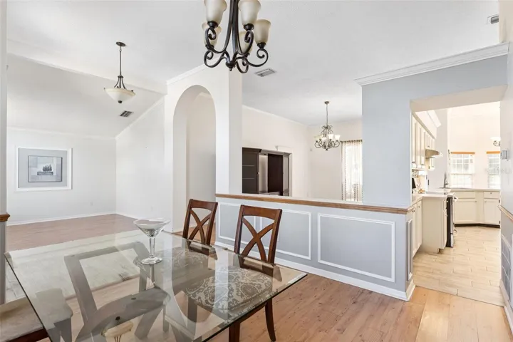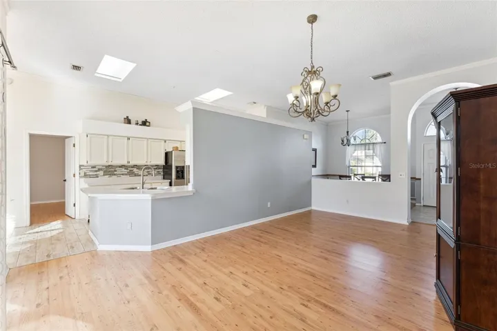 Exceptional opportunity in the heart of South Orlando! Don’t miss this Southchase Gem with PRIVATE POOL! NEW ROOF 2022. This property stands out with its private pool, ideal for entertaining and enjoying Florida living year-round. Tastefully updated with high-end modern finishes. A Charming 1,684-sqft Updated POOL home has 3 bedrooms and 2 bathrooms. Open and bright floor plan featuring a formal dining area and a formal living room. Home possesses architectural features throughout, such as: Crown Molding and Skylights. Arched Windows and Doorways, Wainscotting Cladding, Exterior Double Doors, Vaulted Ceilings, and Sliding Glass Doors. The home reflects pride of ownership. Oversized Primary Bedroom on the first floor with a tiled Spa Style EnSuite Bath. Double Sink Vanity, Glass Wall Frameless Shower w/bench. Spa Style soaking Tub with a large Porthole window for natural light. Kitchen has Stainless Steel appliances, Modern Tile Backsplash, an eat-in kitchen with a separate breakfast Dinette area with tons of natural light overlooking the Pool/Lanai. Blinds, Window treatments, ceiling fans, inside laundry room with shelving. 2 Car Garage, Pavered Driveway, screened pool with covered Lanai. This property stands out with its private pool, fully fenced backyard ideal for entertaining, family, pets, and enjoying Florida living.