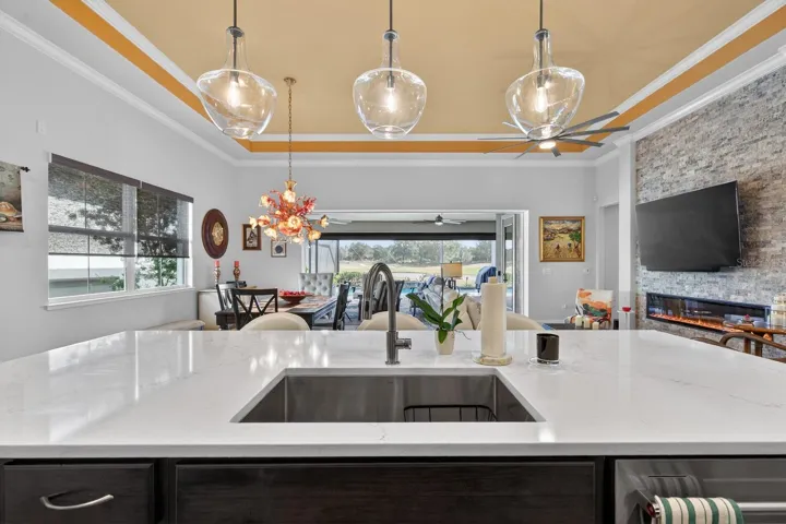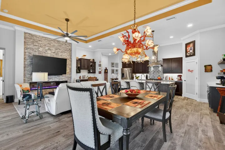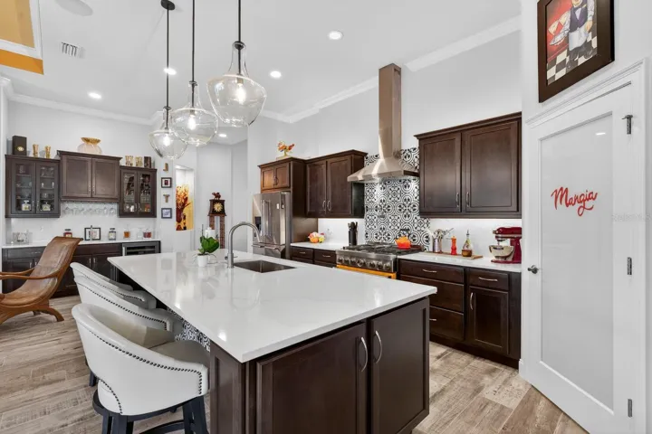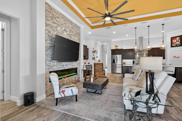 The heart of the residence is an inviting open-concept layout that combines a gourmet kitchen, adjoining dining area, and spacious family room—ideal for both everyday living and effortless entertaining. The chef’s dream kitchen features high-end finishes, including KitchenAid appliances with a six-burner gas range, quartz countertops, a stunning custom tile backsplash, a dedicated coffee station, a full wet bar with beverage refrigerator, and a large walk-in pantry. The adjacent family room is highlighted by a striking stone wall with a linear fireplace.