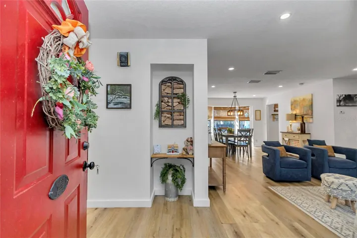 The interior has been tastefully updated and includes a unique garage conversion that can easily be used as a game room, family room, or hobby space. Enjoy the convenience of inside laundry and relax year-round in the enclosed lanai, ideal for soaking in the Florida weather.