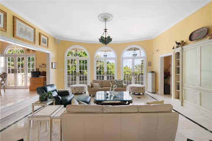 The main level welcomes you with a grand foyer featuring soaring ceilings and a curved staircase, filled with natural light. This level includes formal living and dining rooms, a spacious kitchen with breakfast area, family room, and a versatile billiard room. Expansive open terraces and covered porches connect the interiors to the surrounding gardens and pool, creating seamless indoor-outdoor living.