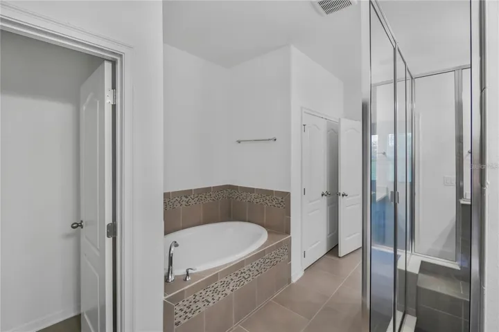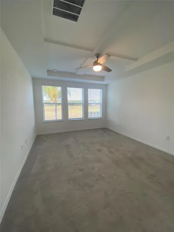 The dedicated office/den includes tile flooring and French doors — ideal for working from home. Ceiling fans are installed in the office, living room, owner’s suite, and second bedroom. The spacious owner’s suite features a tray ceiling, dual vanities, a garden tub, and a large walk-in shower.