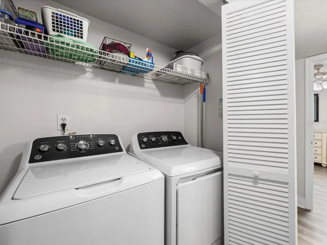 Additional interior conveniences include a new full-size side-by-side washer and dryer located in the laundry closet, along with a large linen closet for added storage. The spacious primary suite offers a comfortable retreat with a walk-in closet and a private en-suite bathroom featuring a custom rebuilt lighted shower, new sink and faucet, and a dedicated vanity beauty bar. Hampton Bay ceiling fans are installed in each bedroom, enhancing airflow and year-round comfort.