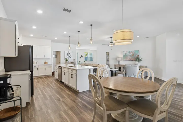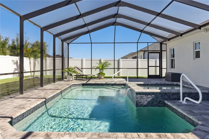 Exquisite pool home nestled on a premium oversized corner lot in the quiet Treymont community of south Lakeland. Designed with a neutral palette, this residence features a 3-car garage, leaded glass front door, and luxury vinyl plank flooring throughout—no carpet! The gourmet kitchen showcases a large quartz island with seating for four, soft-close cabinetry, stainless steel appliances, and a spacious walk-in pantry with custom shelving, complemented by a large laundry room with counter space. Two secondary bedrooms share a Jack-and-Jill bath, while the third bedroom offers a private en-suite. The luxurious primary suite features a tray ceiling, dual vanities, a glass-enclosed shower, and a generous walk-in closet. Step outside to your private oasis featuring a screened-in saltwater heated pool with spillover spa, elegant pavered deck, and ambient nighttime lighting—ideal for both relaxing and entertaining. The enormous corner lot allows plenty of space to spread out and play. Treymont has no CDD and low HOA, come discover the elegance of this home!