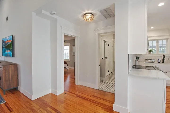 Upon entry, you’ll be greeted by the spacious living room, featuring a cozy L-shaped sectional and a Smart TV—the perfect spot to kick back and relax after a day at the beach. The primary bedroom offers a king-size bed, private doors that open to the backyard, and an attached bathroom with a dual vanity and shower/tub combo. The second bedroom is furnished with a queen-size bed, its own TV, and ample storage for your belongings. A second bathroom provides an updated vanity and a large walk-in shower for added convenience.