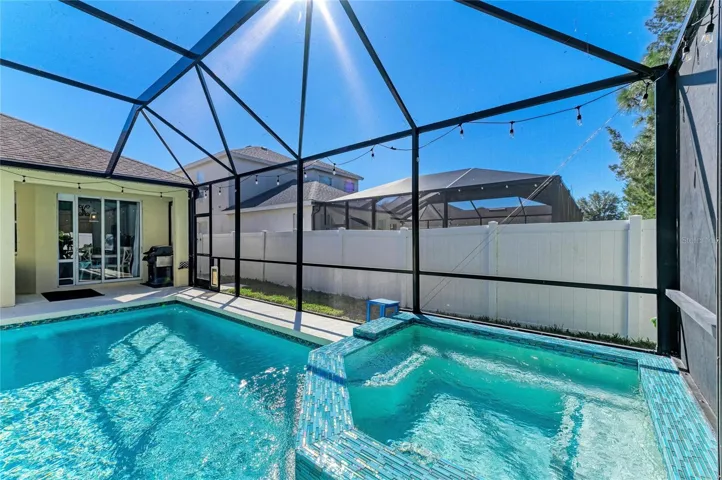 Step outside to your private oasis, where a beautiful saltwater heated pool and hot tub await. Both are gas-heated and securely nestled within a screened cage and covered lanai, allowing for year-round enjoyment. A privacy fence enhances the seclusion, creating a tranquil retreat for relaxation and entertainment. Enjoy beautiful sunsets while relaxing around the pool, entertaining guests or cooking on the grill.