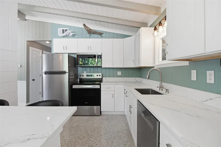 Easy livin’. A perfect blend of old-school cool and 2026 finishes, this mid-century modern bungalow is a true “buy it and move-in tomorrow” type home. Polished terrazzo floors, vaulted ceilings, it’s just fun all over. Fully renovated with crisp coastal selections. It has a nice sunroom for a large party gathering or workout room, art studio, play area. Carport equipped with RV hookups and motor court driveway. Plenty of parking space for bikes, scooters, and golf carts. The landscaping is immaculate, professionally designed by the owner including an advanced drainage system helping keep you dry 24/7/365. Not far from the Village, close to the beach, and minutes to North bridge. Clean, affordable, easy beach living.