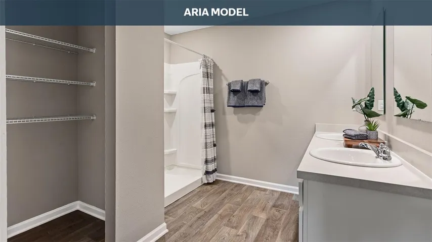 At the heart of the home is a bright, expansive layout that connects the kitchen, dining area, and living room. The kitchen features a large island that serves as a hub for cooking, casual dining, or entertaining. Whether you are hosting friends or enjoying a quiet night in, the Aria’s layout makes everyday living both easy and enjoyable. Natural light fills the living spaces thanks to oversized windows that enhance the home’s warm and inviting feel. The main suite is privately located and offers a large bathroom with a double vanity and walk-in shower, along with a generous walk-in closet that makes organizing a breeze. Two additional bedrooms provide space for family, guests, or a home office.