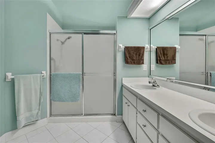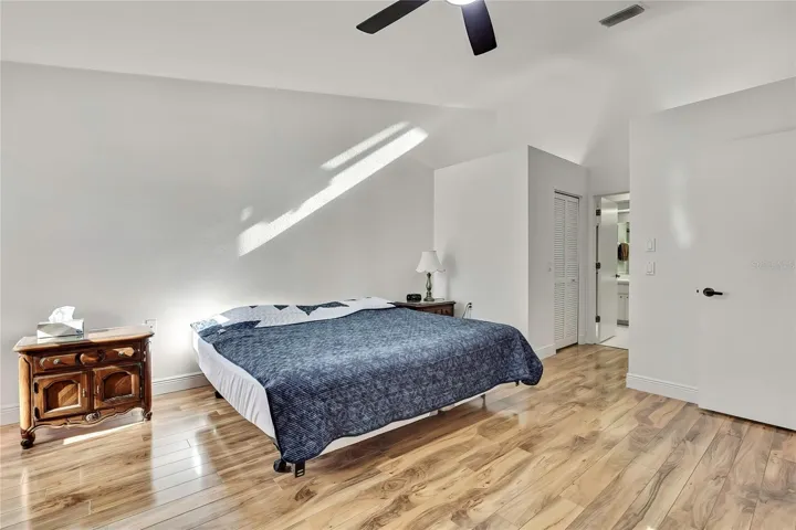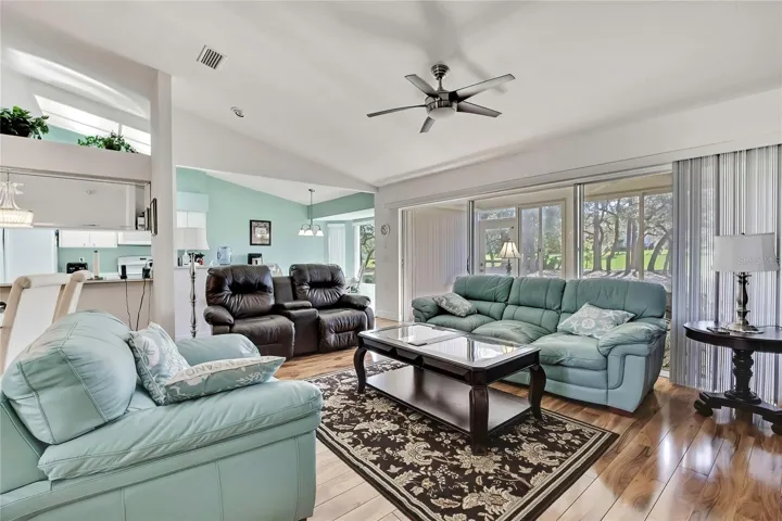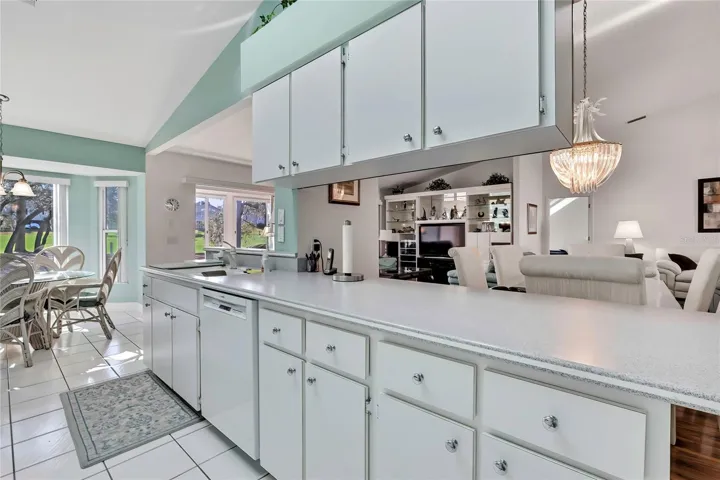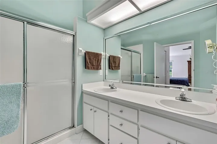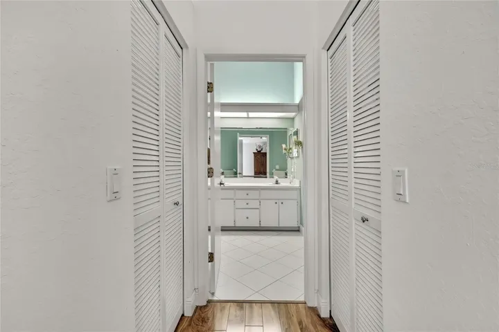 The spacious primary suite features cathedral ceilings, laminate flooring, two walk-in closets, a double vanity with dual sinks, skylight, walk-in shower, and linen closet. The second bedroom offers high ceilings, laminate flooring, and a large walk-in closet, while the second bathroom is bright and neutral with a tub/shower combination and white vanity. Enjoy year-round comfort in the enclosed back lanai with heat and air, tile flooring, and new vinyl acrylic windows installed in 2022 that slide open, showcasing the beautiful golf course and water views.