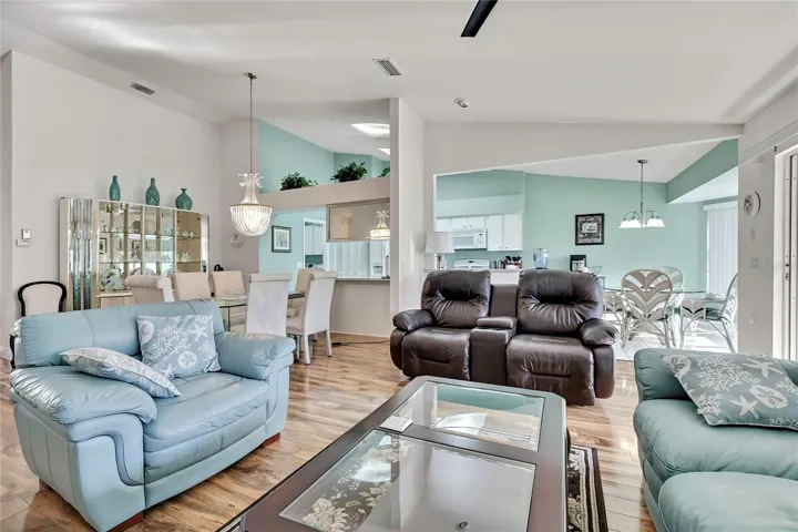 This beautiful turnkey, fully furnished 2-bedroom, 2-bath villa with a 2-car garage is perfectly situated on the golf course with serene water views overlooking Grand Pines, hole #10, in the desirable Timber Pines 55+ gated community. Enter through the double-door entry into a light-filled home featuring high ceilings throughout and laminate flooring in the great room, living room, and family room, creating an open and inviting layout. The kitchen offers Corian countertops, a Corian sink, pantry, and white tile flooring, along with ample cabinet space. A large laundry room includes washer, dryer, and additional cabinetry.
