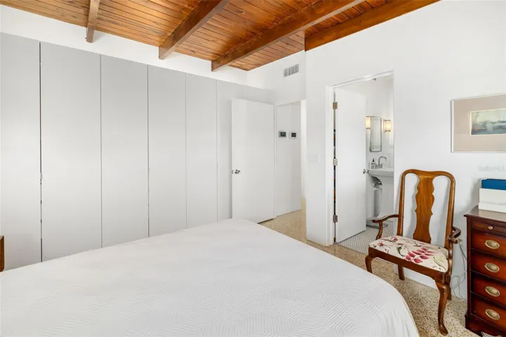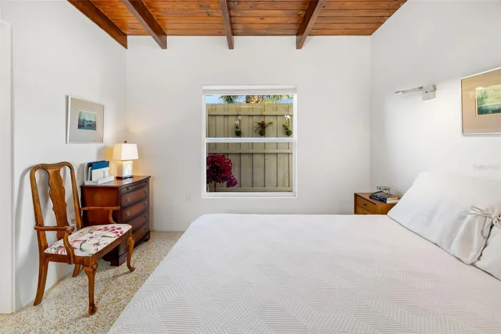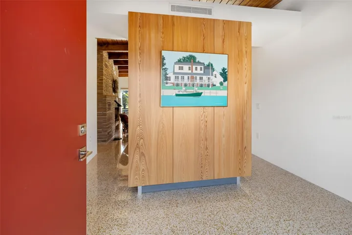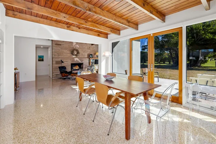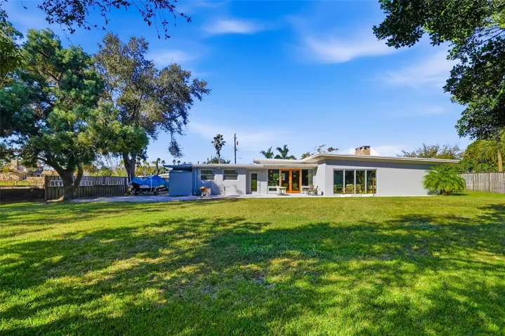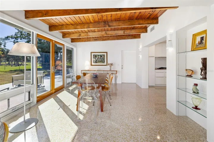 A rare opportunity to own a thoughtfully preserved and expertly re-imagined mid-century modern residence overlooking Sarabay Country Club, where architectural integrity and modern performance coexist seamlessly. This iconic Sarasota home was re-envisioned by Seibert Architects and Ball Construction, honoring the original mid-century vision while elevating it for contemporary living. Authentic design elements were intentionally retained, including the striking architectural wood-burning fireplace, exposed wood beams set into the stained ceiling, and beautifully refinished original terrazzo flooring—features that anchor the home in its era while remaining timeless. Walls of impact glass frame unobstructed views of Sarabay Country Club hole 8, creating a strong visual connection between indoor living spaces and the surrounding landscape. The result is a home that feels both grounded and expansive, filled with natural light and framed by clean architectural lines. The residence offers a two-bedroom, two-bath main house, complemented by an attached one-bedroom, one-bath studio or third bedroom, providing architectural flexibility ideal for guests, a private office, or multigenerational living—without compromising the integrity of the original design. The kitchen was enlarged and completely redesigned to support modern functionality while respecting the home’s architectural language. Updates include new cabinetry, appliances, and Caesarstone countertops, creating a cohesive and efficient workspace that integrates seamlessly with adjacent living areas. Behind the scenes, the renovation prioritized performance, durability, and longevity. Major infrastructure improvements, including all new electrical and water piping, were completed in 2018, along with the replacement and strategic relocation of the HVAC system to maximize interior living space. Impact windows and doors enhance safety and storm protection, while interior walls were constructed with four feet of water-resistant drywall, offering added protection and peace of mind. A new roof was installed in 2023, completing the home’s comprehensive modernization. Set on a large, fenced lot with low-maintenance landscaping, the property allows the architecture and setting to take center stage. Ideally located within walking distance of Sarabay Country Club, with culinary cards available by joining the voluntary neighborhood association for just $30 per year, and only a short drive to downtown Sarasota, area parks, and cultural amenities.