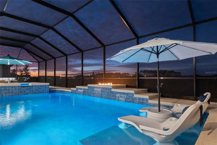 This exceptional Dunbar model showcases refined design, high-end finishes, and resort-style outdoor living, anchored by a one-year-old pool and spa with fire feature, full screen enclosure, and retention pond–front privacy.