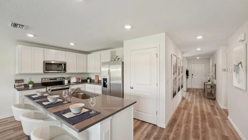 One or more photo(s) has been virtually staged. Under Construction. This all concrete block constructed, one-story home optimizes living space, featuring an open-concept kitchen overlooking the great room and outdoor patio. The well-appointed kitchen comes with all stainless-steel appliances, including a built-in dishwasher, range, and microwave. Bedroom 1 is located at the rear of the home for privacy and features an ensuite bathroom and walk-in closet near the bathroom. Two additional bedrooms at the front of the home are separated by the second bathroom. The third bedroom is located across the hallway near the laundry room. Pictures, photographs, colors, features, and sizes are for illustration purposes only and will vary from the homes as built. Home and community information including pricing, included features, terms, availability and amenities are subject to change and prior sale at any time without notice or obligation. CRC057592.