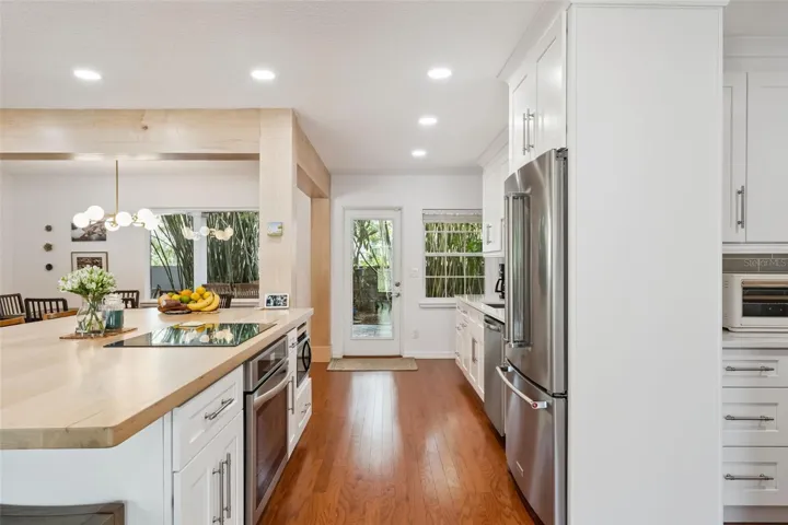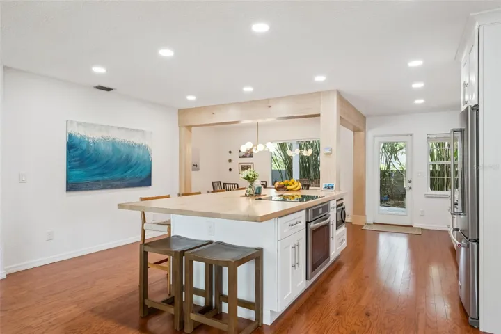 An open floor plan and abundant natural light create a bright, welcoming interior with excellent storage throughout. The recently remodeled kitchen is a true centerpiece, showcasing shaker-style cabinetry, quartz countertops, and a stainless steel appliance package with built-in oven and cooktop. A maple wood island countertop with seating adds warmth and character, complemented by a walk-in pantry, dry bar with built-in wine rack and wine fridge, and a dedicated coffee bar.