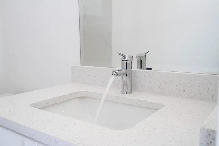 The primary suite offers a clean, modern bathroom with dual sinks, quartz counters, and a tiled shower. Additional bathrooms feature stylish tile finishes and quality fixtures. The home also includes a 2-car garage with Tesla charger and comes with a 10-year structural warranty for added peace of mind.