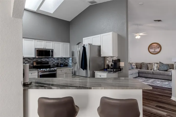 3/2/2 – POOL HOME – This stunning turnkey home features resort-style amenities and has been meticulously maintained. It’s a perfect blend of MODERN UPGRADES with the Florida lifestyle. The OPEN FLOOR PLAN includes a vaulted ceiling in the great room and a flexible bonus space that is ideal for a home office, den, or entertainment area, just to name a few. Luxury vinyl plank flooring flows throughout the main living areas. The CHEF’S KITCHEN showcases MARBLE COUNTERTOPS, soft-close cabinetry, a DOUBLE OVEN, all-NEW APPLIANCES, and designer finishes throughout. The double sliding doors seamlessly connect the great room to the pool deck, creating an exceptional environment for indoor-outdoor entertainment. The FULLY RENOVATED POOL AND SPA serve as the crown jewel of this property, featuring updated tile, a RESURFACED POOL AND SPA, a NEW HEATER, LED lighting, a SALT SYSTEM, and a modern pump. Access to the pool is available from the primary suite, guest bedroom, kitchen, living room, and guest bathroom. The sale includes a WIRELESS POOL CLEANER, a wireless skimmer, all maintenance equipment, a high-top outdoor dining set, and a 55-inch outdoor TV. The fenced side yard provides ADDITIONAL PRIVACY and functionality with direct access from the laundry room. Both bathrooms feature soft-close cabinets and drawers, custom tile work, and an ANTI-FOG MIRROR in the primary bathroom. The HVAC system was upgraded in 2018 and includes a SURGE PROTECTOR, UV LIGHT AND HEPA FILTER, all maintained on a regular service schedule. A whole-house surge protection system and a GAS GENERATOR provide additional peace of mind. Recent landscaping updates complete this move-in-ready gem. Schedule a showing to get a close-up look at this beauty; you won’t be disappointed.