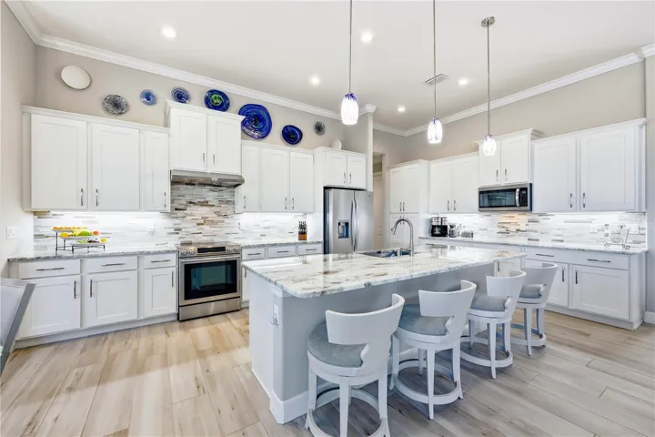 The open concept layout features abundant natural light and pocket sliding glass doors that fully open the home to the covered lanai, creating seamless indoor outdoor living ideal for entertaining. The kitchen features brand new countertops and all new appliances, and the kitchen and great room are oriented to capture stunning canal views. Elegant tray ceilings add architectural interest throughout the main living spaces. Power privacy blinds enhance the great room and dining area, while plantation wood shutters are featured throughout the home.